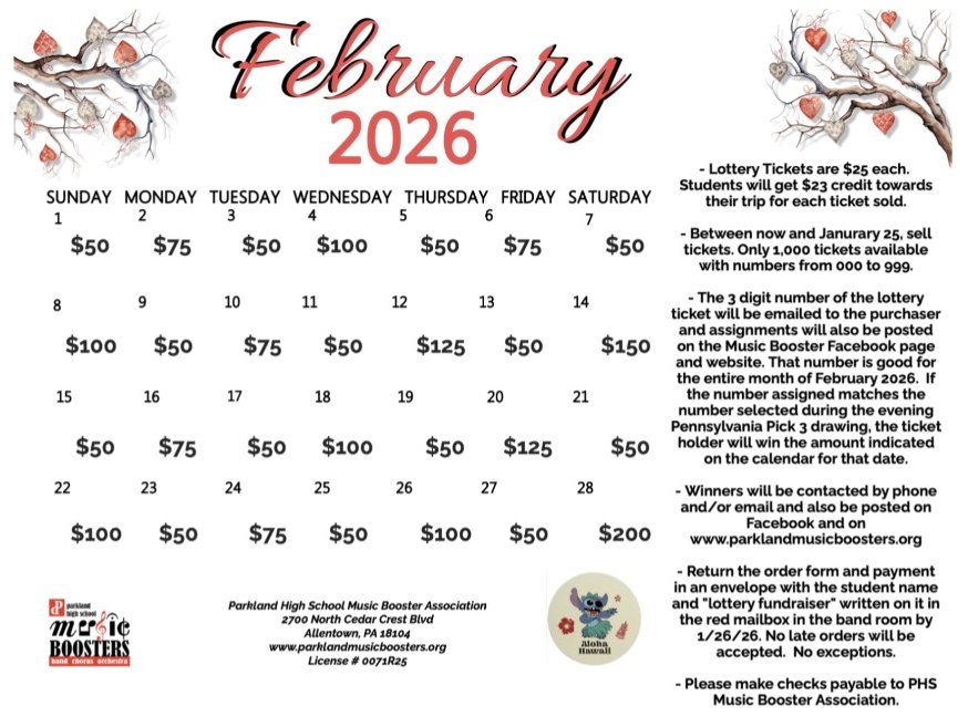 The Parkland High School Music Booster is excited to kick off our February Lottery Calendar Fundraiser! This fundraiser helps our music families raise money for their students’ trip accounts, supporting programs and travel opportunities run by the PHS Music Department.